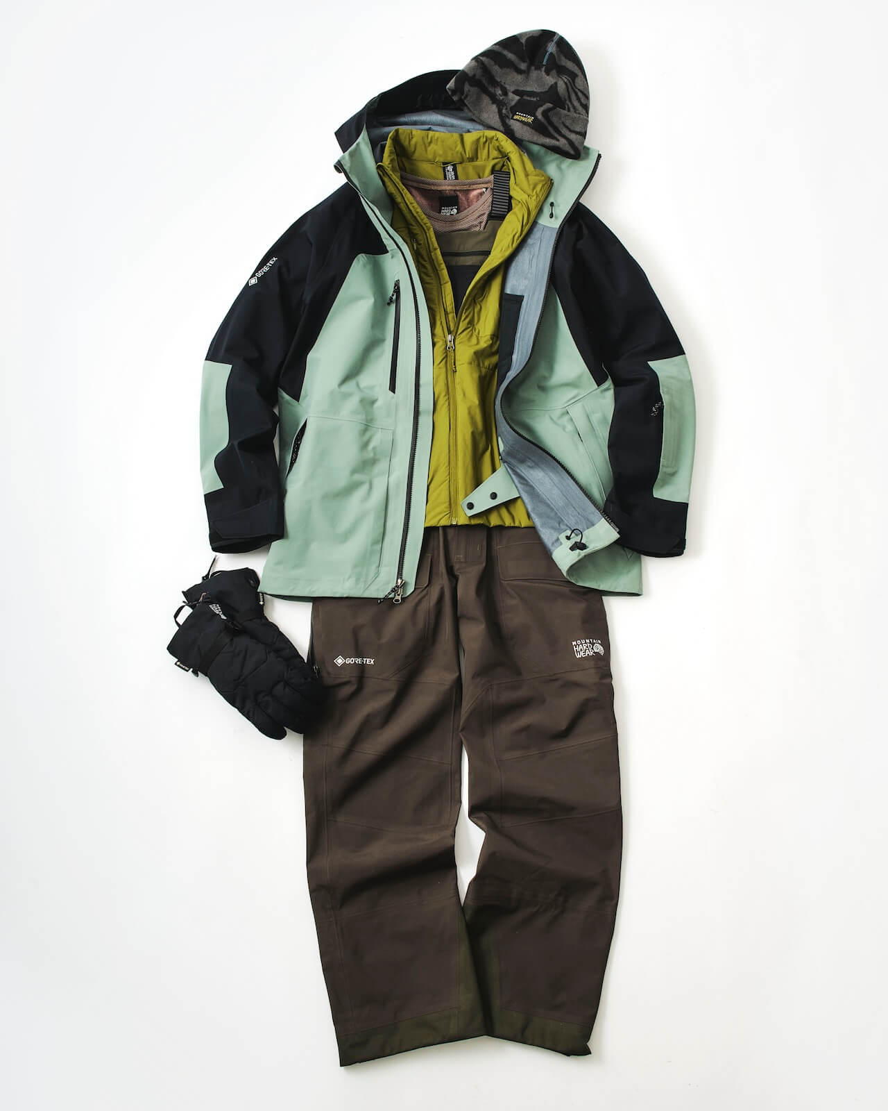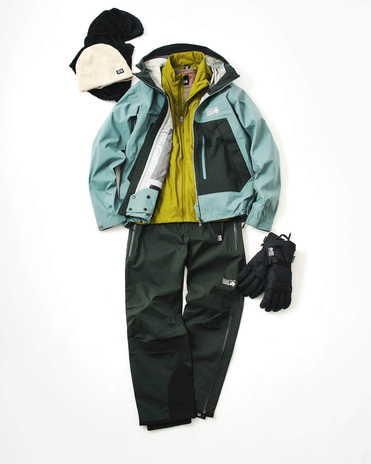 ハードシェル/スノーストームジャケット¥57,200、ミドルレイヤー/コアアロイジャケット¥34,100、ベースレイヤー/エアメッシュロングスリーブクルー¥12,100、パンツ(シェルパンツの下に着用)/コアアロイタイツ¥20,900、シェルパンツ/スノーストームパンツ¥56,100、帽子/ハイキャンプビーニー¥3,960、ポーラテックハイロフトバラクラバ¥6,600、グローブ/オールトラックスゴアテックスグローブ¥14,850