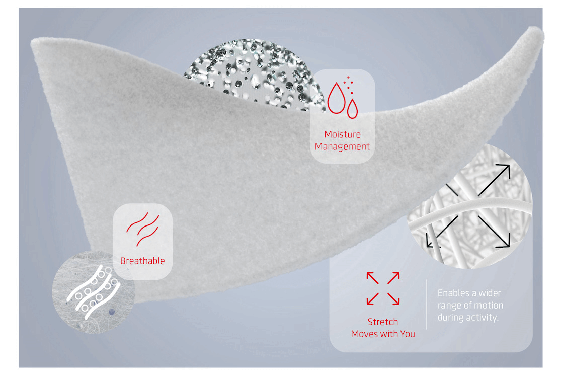 化繊中綿の最高峰のひとつとされるPrimaloft®シリーズの中でも、耐湿性と保温力に優れ、動きへの追従性や通気性の高さが特徴。濡れても保温性を維持し、行動中の熱や湿気を効率よく逃がす。