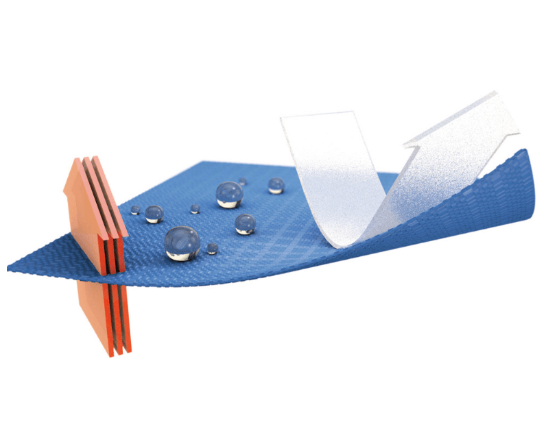 PERTEX ® QUANTUM AIRの概念図。20デニールの極細糸を高密度に織っており、優れた引き裂き強度を誇る。通気性と防風性という相反する性質を両立し、軽い雨をしのぐ撥水性やストレッチ性も備える