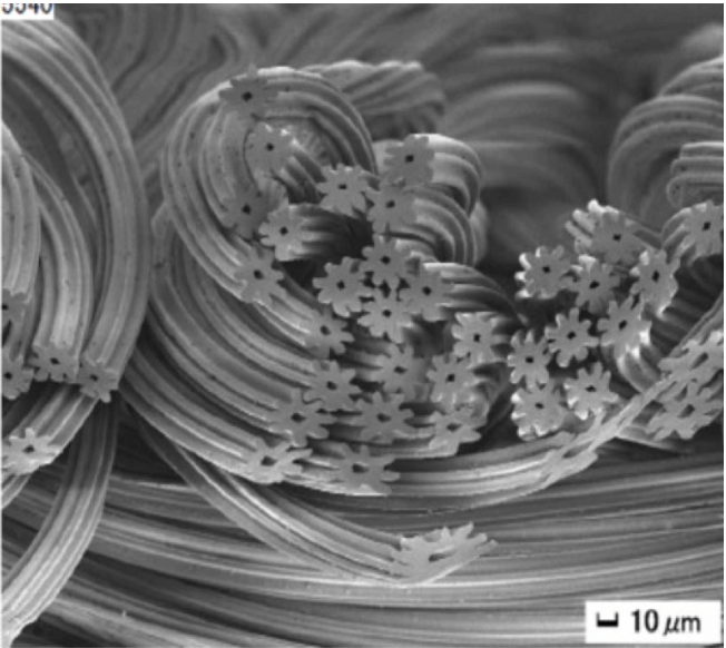 Octa ®の断面図。8本の突起をもつ中空糸が毛細血管のように絡まることで、優れた保温・通気・速乾性を発揮する