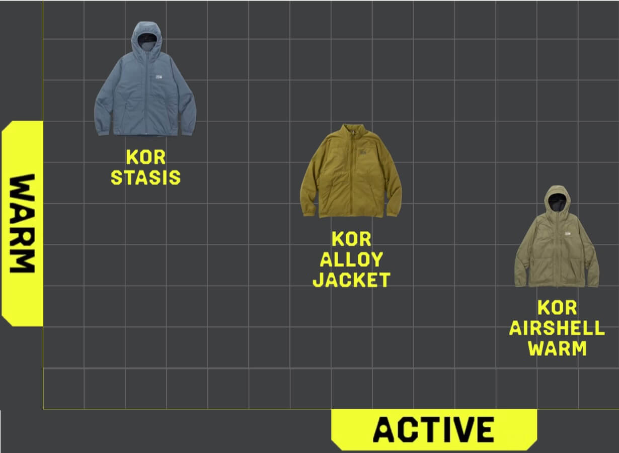 コアシリーズには保温力に応じて「コアエアシェルウォーム」、「コアアロイジャケット」、「コアステイシス」の3モデルがラインナップされている。